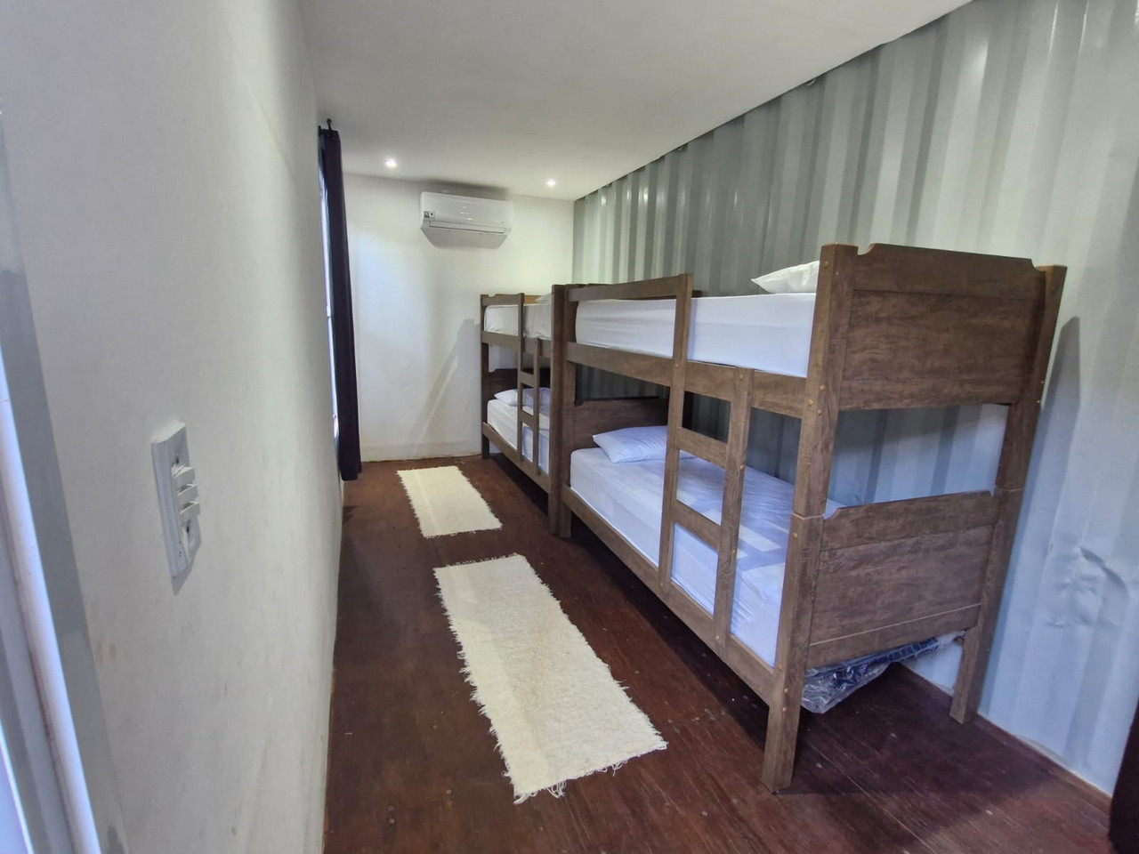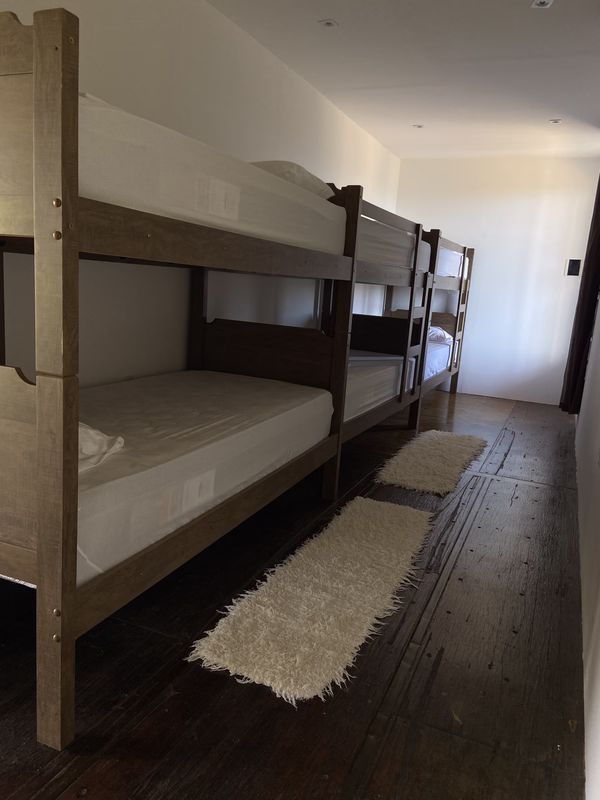 São 4 acomodações independentes: 2 quartos de casal e 2 quartos coletivos com beliches.
